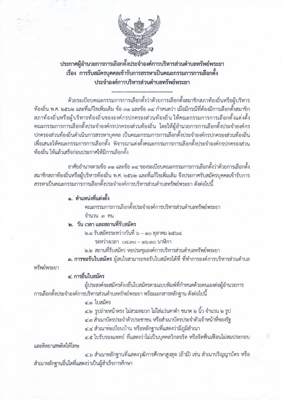 องค์การบริหารส่วนตำบลทรัพย์พระยา ประชาสัมพันธ์การรับสมัครรับเลือกตั้งสมาชิกสภาองค์การบริหารส่วนตำบลและนายกองค์การบริหารส่วนตำบล ระหว่างวันที่ 1 - 5 ธันวาคม 2568 เวลา 08.30 น. - 16.30 น. ที่ทำการ อบต. [27 ตุลาคม 2568]
