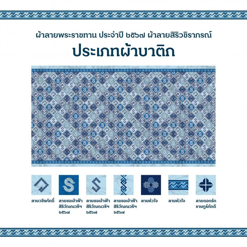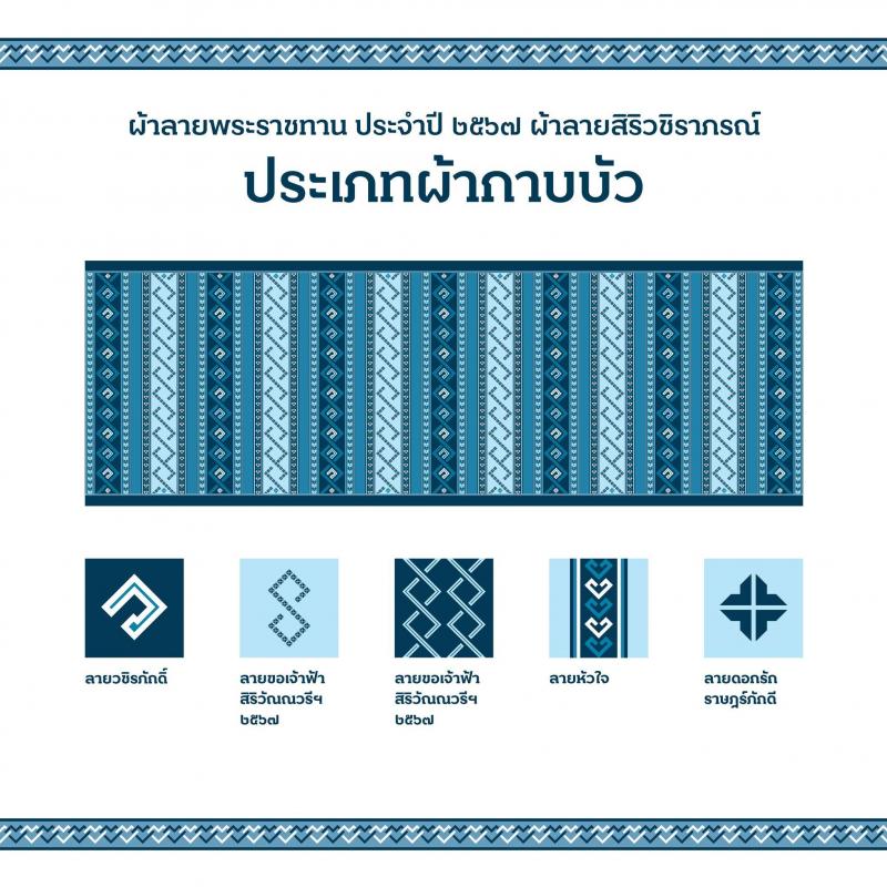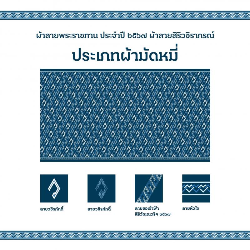 "ผ้าลายพระราชทาน จำนวน 4 ลาย" เนื่องในโอกาสมหามงคลเฉลิมพระชนมพรรษาพระบาทสมเด็จพระปรเมนทรรามาธิบดีศรีสินทรมหาวชิราลงกรณ พระวชิรเกล้าเจ้าอยู่หัว ทรงเจริญพระชนมพรรษา 6 รอบ 72 พรรษา สมเด็จพระเจ้าลูกเธอ เจ้าฟ้าสิริวัณณวรี นารีรัตนราชกัญญา ได้ทรงศึกษาค้นคว้าลวดลายผืนผ้าจากทุกภูมิภาคทั่วประเทศ และทรงนำมาออกแบบลายพระราชทานเนื่องในปีมหามงคลนี้ โดยมีลายพระราชทานหลักจำนวน 4 ลาย ได้แก่ ลายวชิรภักดิ์, ลายขอเจ้าฟ้าสิริวัณณวรีฯ 2567, ลายหัวใจ และลายดอกรักราษฎร์ภักดี พระราชทานแก่ศิลปินช่างทอผ้าและหัตถกรรมไทย ผ่านทางกระทรวงมหาดไทย เมื่อวันที่ 22 กุมภาพันธ์ 2567 ณ จังหวัดอุบลราชธานี โดยพระราชทานแบบตั้งต้นไว้ 4 ประเภท ได้แก่ ประเภทผ้ากาบบัว, ประเภทผ้ายก, จก, ขิด, แพรวา, ประเภทผ้ามัดหมี่ และประเภทผ้าบาติก ทุกประเภทสามารถนำลายพระราชทานหลักทั้ง 4 ลายนี้ ไปถักทอผสมผสานกับลวดลายภูมิปัญญาพื้นถิ่นตามความคิดสร้างสรรค์ของศิลปิน #ผัาลายพระราชทาน2567